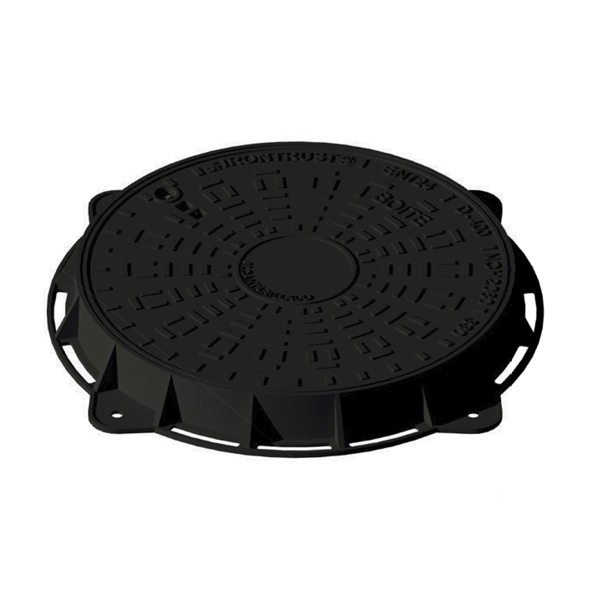 Fuerza de ensayo 400 KN. Provista de una junta de polímero anti ruido y antivibración. Tapa circular provista de 4 orificios para su anclaje. Ademas de 1 ranura para su manipulación y de 1 orificio para su sistema de seguridad.